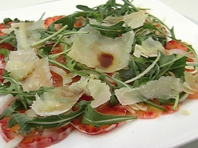 Изящная закуска на любой вкус.Состав:апельсины — 2 штуки;лук — 1 штука;сыр — 100 гр;несколько листьев всежего салата;оливковое масло, бальзамический уксус, соль — по вкусу.